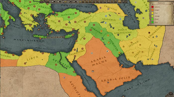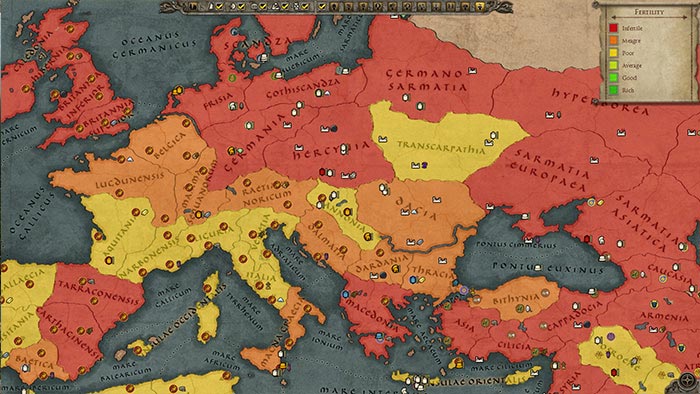 Две Римские Империи, с самого начала игры, находятся на самых плодородных землях в игре, а плодородность земли начинает падать после того, как вы покидаете границы Рима - территорию под властью варварских племен. В частности, Западная Римская Империя, стоит на очень зыбкой почве; имея слишком мало войск, чтобы защитить все границы империи, она должна будет пойти на некоторые уступки, чтобы выжить, так что самыми плодородными землями придется пожертвовать, иначе западная империя рискует быть полностью уничтоженной.