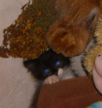 У него кто то из родичей дворняга, а кто то породитсая сиамская, поэтому глаза такие. 5 недель, глиста такая ...