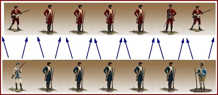 - при приближении противника после первого залпа легкую пехоту нужно отвести за свой строй, иначе линейные отряды противника будут вести огонь по ней, а ваши линейные отряды не смогут его вести. Но как только противник подошел на дистанцию выстрела по основной пехоте, легкую пехоту сквозь ряды можно вернуть на место, и тогда она тоже сможет эффективно участвовать в перестрелке (либо можно подвести основную пехоту).