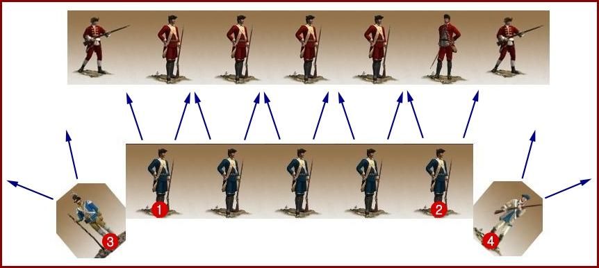- отряды 5 и 6 всегда могут перестроиться в линию если вам это нужно, в отличие от обычной линии, где перестроиться в фланг отряд, завязнувший в перестрелке вряд ли сможет без больших потерь.