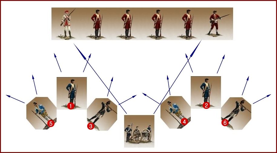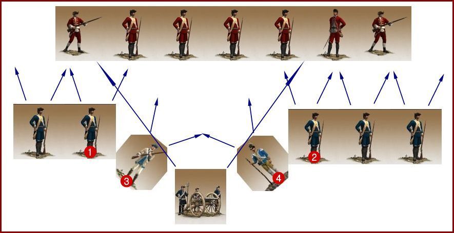 - отряды 1 и 2 могут отвлечь центральные отряды противника на себя, и тогда артиллерия будет просто расстреливать их картечью, нанося огромные потери (отряды 1 и 2 должны быть морально устойчивы)