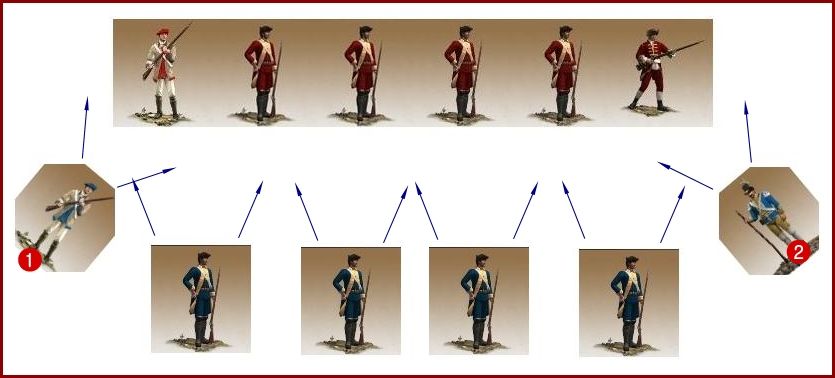 Для всех пехотных построений: когда вы выстраиваете строй пехоты, постарайтесь чередовать более слабые отряды с сильными, например гвардию лучше окружить ополчениями (если они есть), тогда в перестрелке они будут более стойко переносить потрясения, засчет повышения боевого духа. А так же впереди можно при любом построении размещать стрелков.
