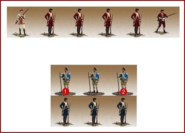 Построение в две линии эффективно при использование совместной тактики легкой и основной пехоты. Отряды основной пехоты уступают в дальности, а легкой – в огневой мощи. Совмещая их можно получить очень сильную группировку. Дело в том что легкая пехота сидит на колене (в режиме тактика легкой пехоты), и стреляет с колена тоже. Основная пехота (и гвардия в том числе) стреляет стоя. Соответственно получается, как стрельба в три шеренги, только легкая пехота не встает – а стреляет сидя, не мешая вести огонь задним отрядам пехоты.