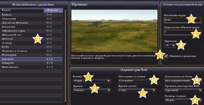 (9) "Сражение. Карты и игроки". В данном поле перечислены названия карт, доступные при игре по сети стим, а также количество игроков, доступных для данной карты.