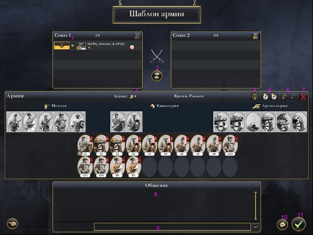 (4) «Размер отряда» позволяет установить количество солдат в отряде. На примере линейной пехоты: