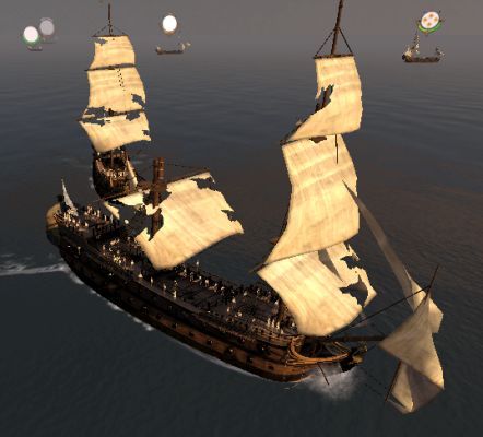 После того как AI подойдет уже совсем близко и начнет завязывать бой, нужно выходить из боя – разрывать дистанцию и создать новую точку сбора (не обязательно уже по ветру). При смене позиции один ваш корабль, наименее пострадавший, должен быть позади колонны (хотя строй соблюдать не обязательно, здесь важнее скорость) и должен прикрывать книппелями основной флот от единичных преследователей. Выход на новую точку сбора осуществляется на максимальной скорости, кроме группы прикрытия.