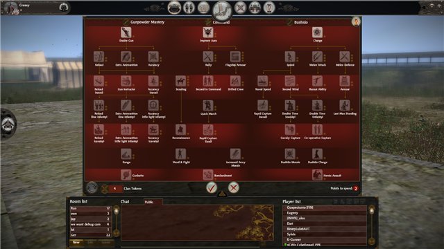 Дерево прокачки самого генерала в Total War: Shogun 2 - Закат Самураев (Fall of the Samurai) также создано с нуля. Раньше можно было отмаксить одну ветку и еще оставалось 5-6 очков, которые распределили в другие ветки. Теперь же финальное умение каждой ветки требует 19 вложенных в этой сфере очков. Подробнее об этих ветках: первая отвечает за генерала-стрелка, также позволяет увеличить боезапас, точность и перезарядку у линейной пехоты, снайперов и конных стрелков. Финальная абилка, ганбатта, дает бафф (улучшение) по площади вокруг генерала на мораль, атаку и перезарядку. Центральная ветка – командирская, заточенная под усиление морально-волевых качеств армии. Также там можно улучшить скорость передвижения юнитов и скорость захвата ключевых точек, можно открыть умение, которое позволяет видеть войска соперника на этапе расстановки, можно открыть «боевую решимость». Финальное умение – бомбардировка, можно 2 раза за бой попросить флот разбомбить указанный вами участок карты. Неплохое умение, убивает прилично юнитов, позволяет разрушить строй соперника перед атакой. Третья ветка – прокачка генерала бойца, а также различные баффы на юнитов ближнего боя, также есть умение на захват точек кавалерией (не спешивая ее с коней). Финальное умение – героический натиск, бафф по площади вокруг генерала на скорость, мораль и выносливость.
