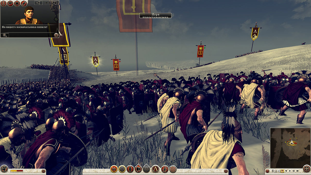 Сами битвы весьма зрелищны. Обещанная СА качественная анимация действительно впечатляет. Солдаты наступают, предусмотрительно укрываясь щитами от вражеских стрел, некоторые отряды могут сформировать особые построения, к примеру, римские легионеры могут перестроиться в черепаху, гоплиты и сариссфоры могут образовать фалангу, при этом замедлив движение, но соблюдать строй, и так далее в этом роде. Короче говоря, по красоте и проработке битв у СА до сих пор нет равных. Конечно, при стычке многотысячных армий массовой кучи-малы не избежать, ведь и в реальности происходило примерно так же.